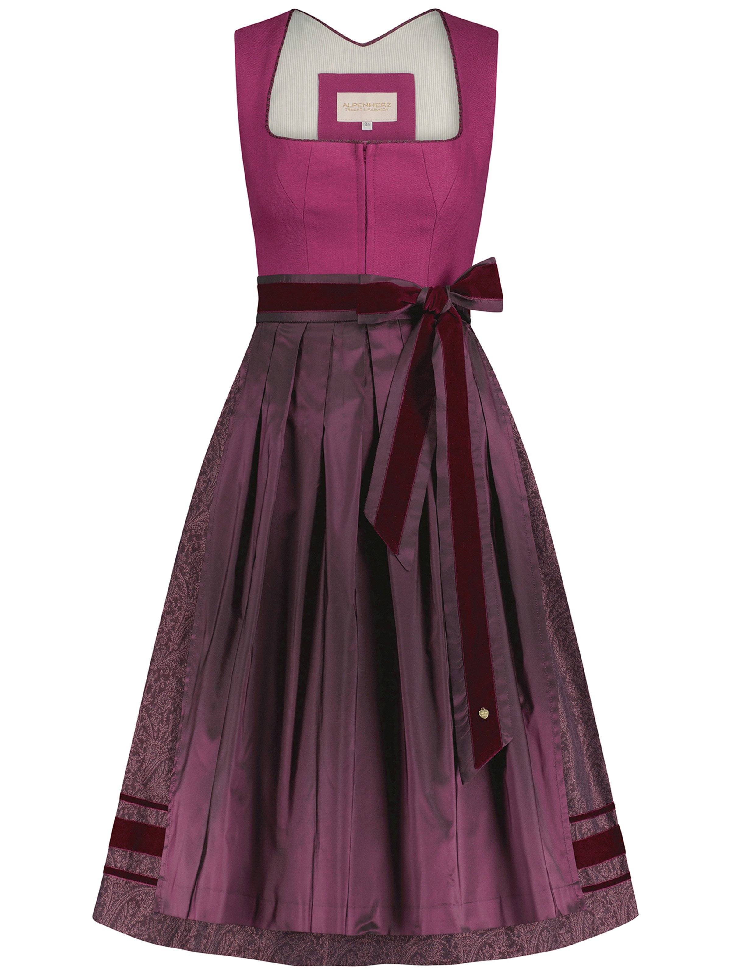 - Beerenfarbende Schürze in schimmernder Seidenoptik mit Samtborte an Schürze und Schleife
