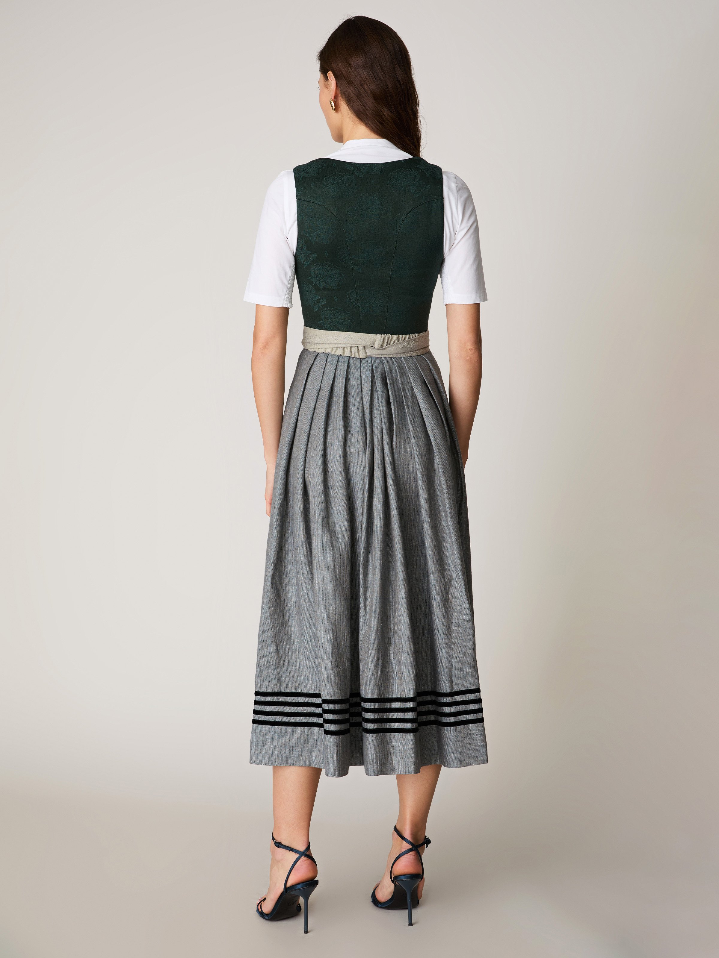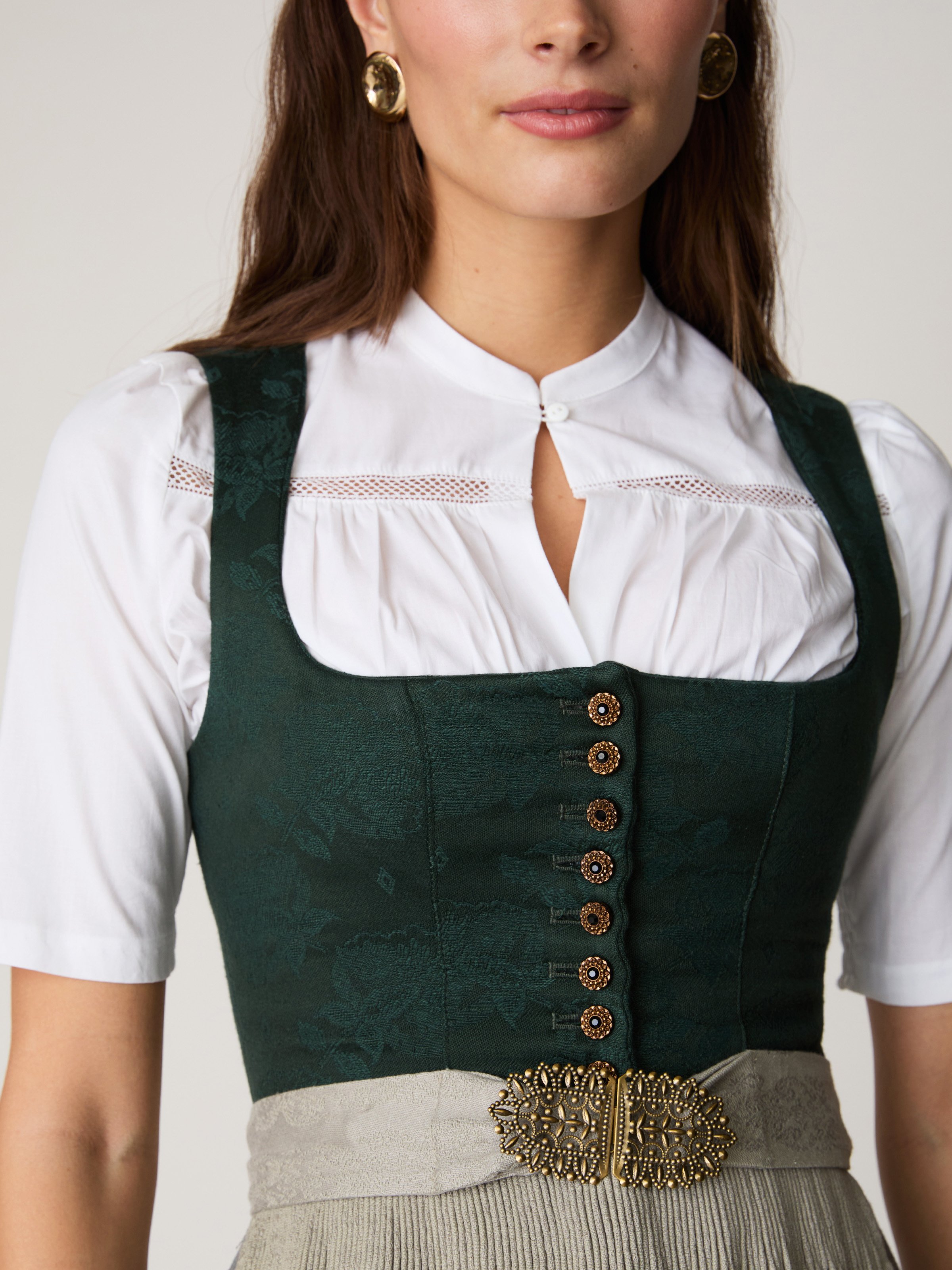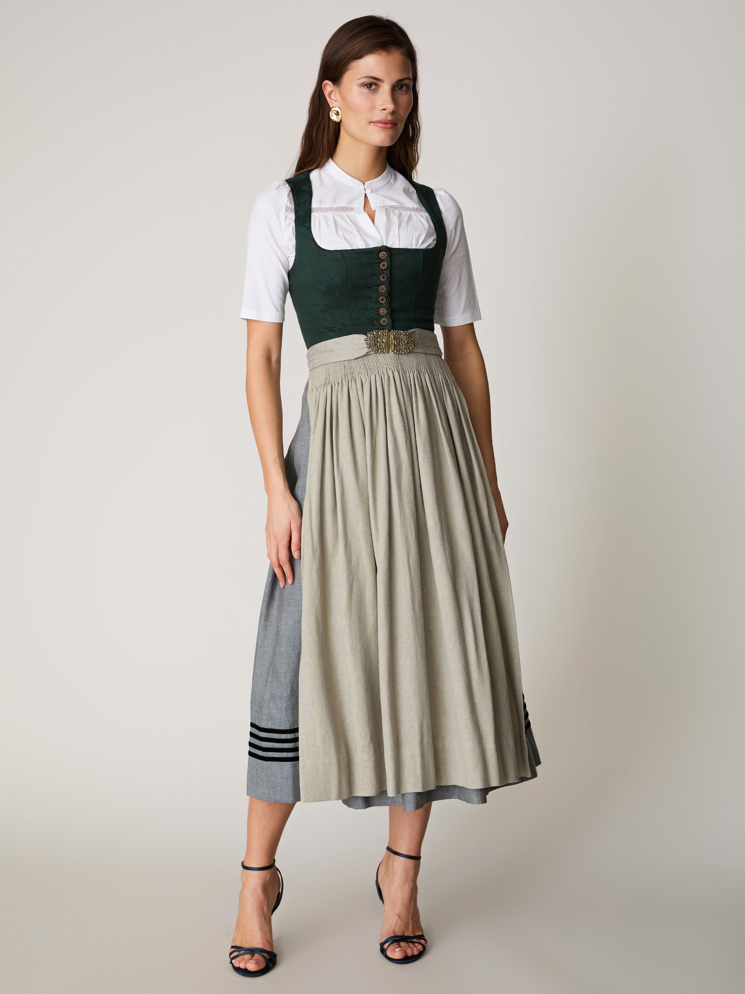 - Inklusive handgestiftelter beiger Dirndlschürze: gebunden oder mit edler silberner Schnalle