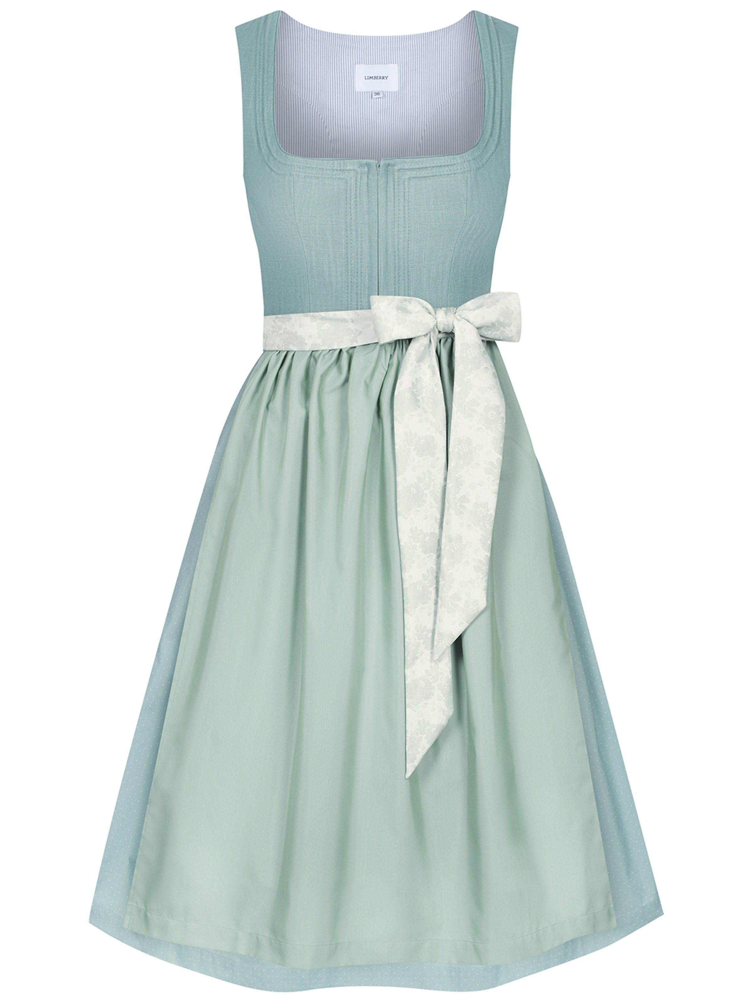 - Inklusive zwei Dirndlschürzen: eine blau gestreifte Baumwollschürze und eine grüne Dirndlschürze mit floralem Schürzenband