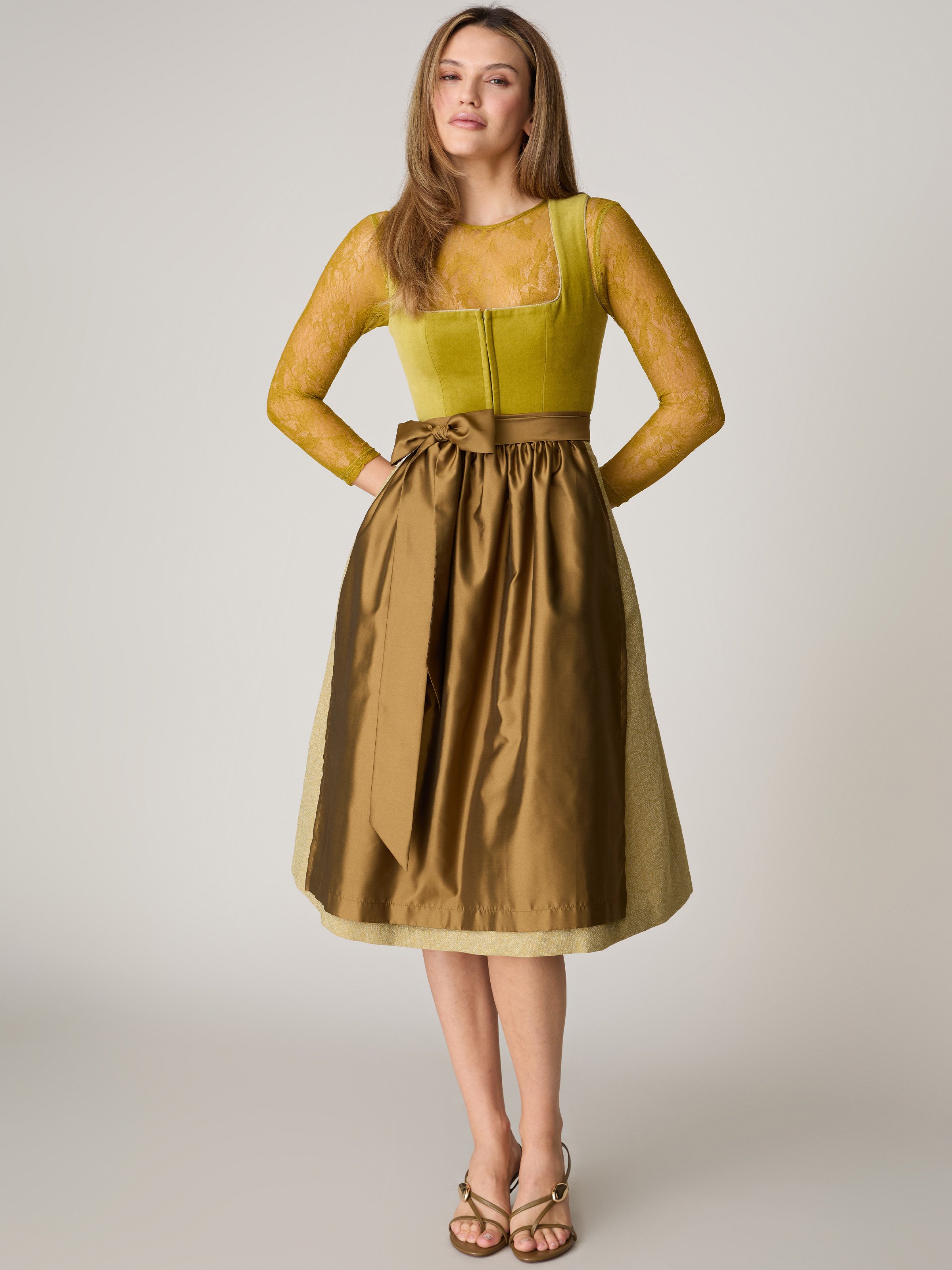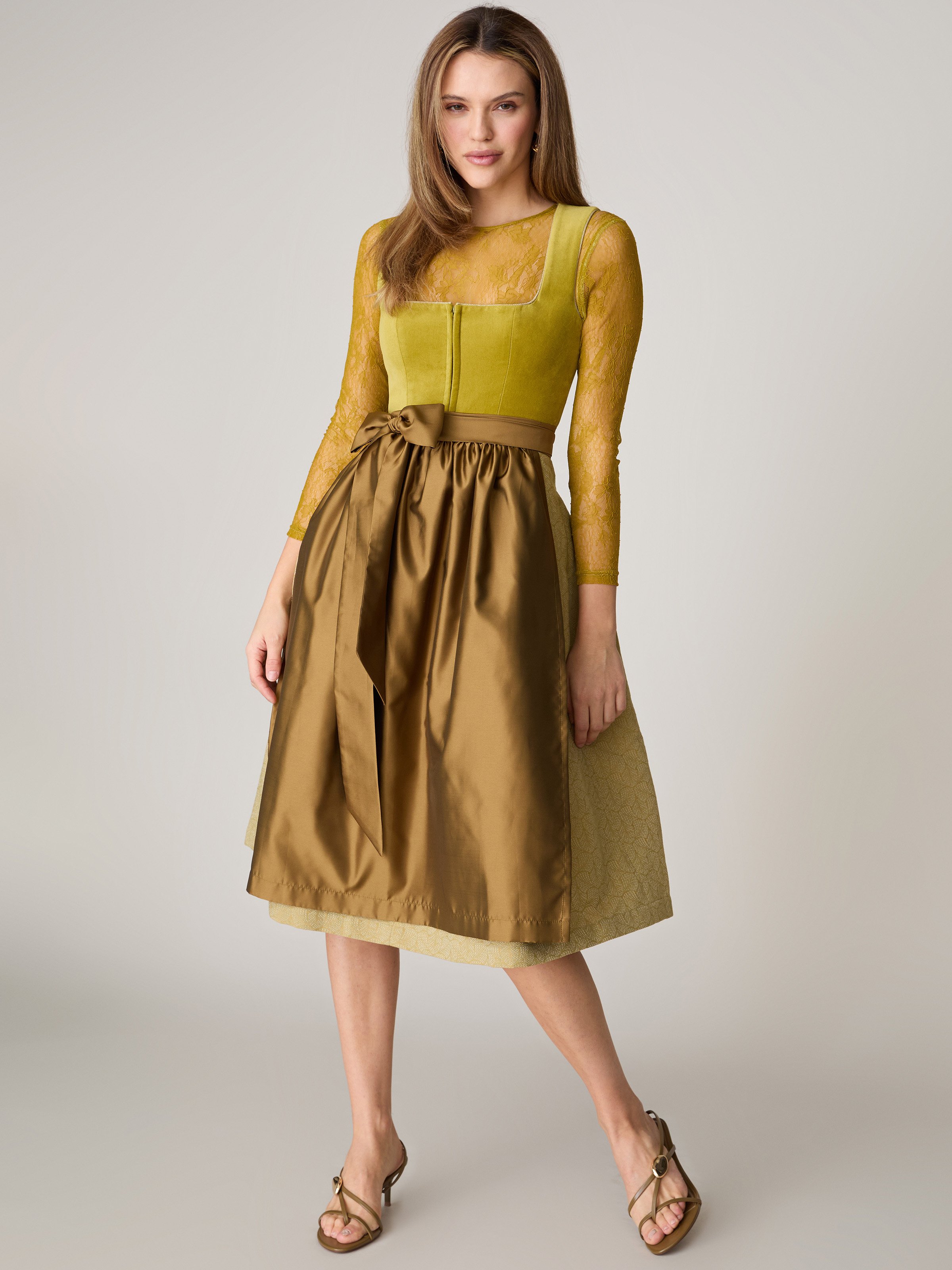 - Inklusive zwei Dirndlschürzen: eine Dirndlschürze in Khaki in Seidenoptik und eine grüne Dirndlschürze