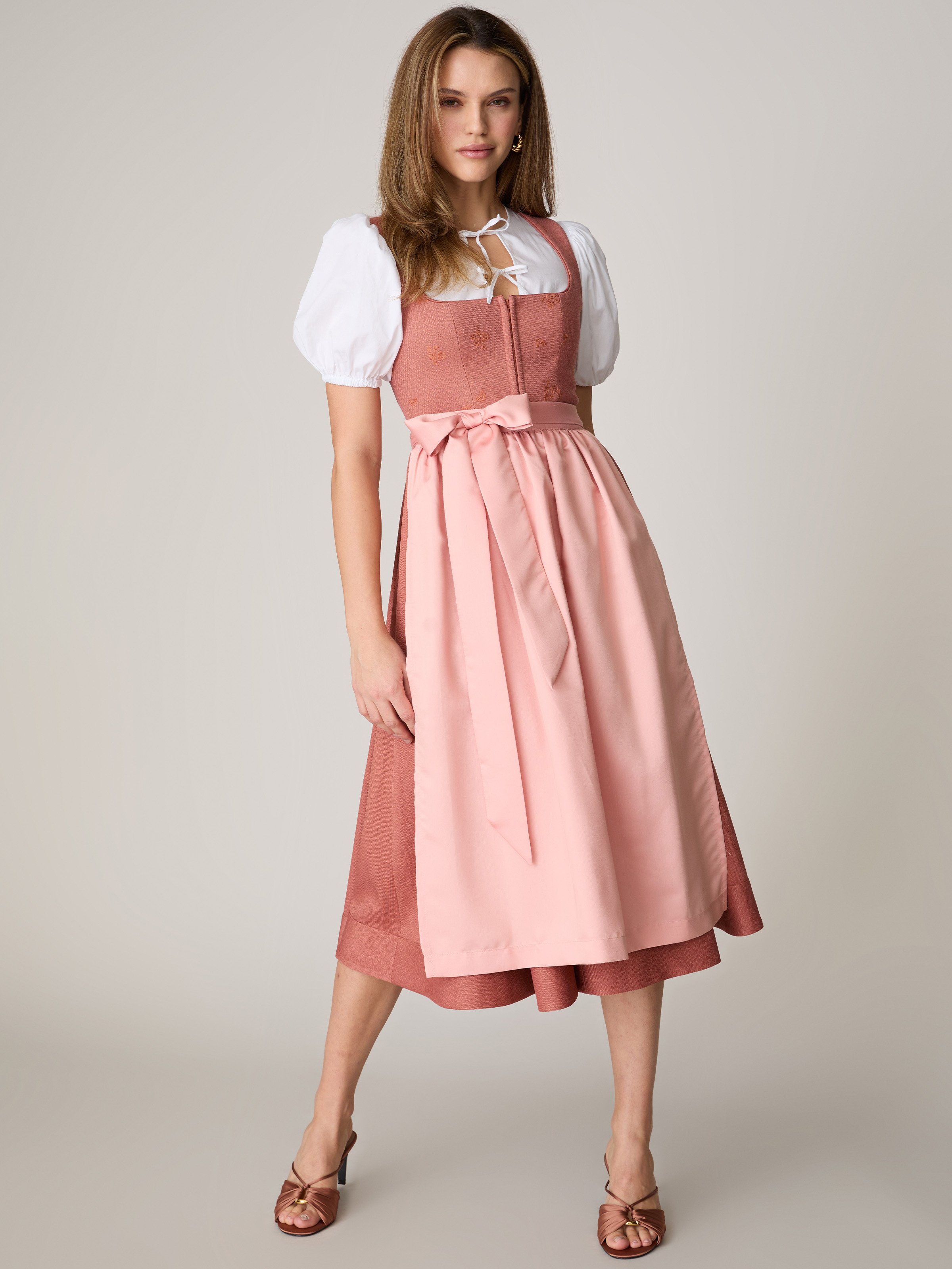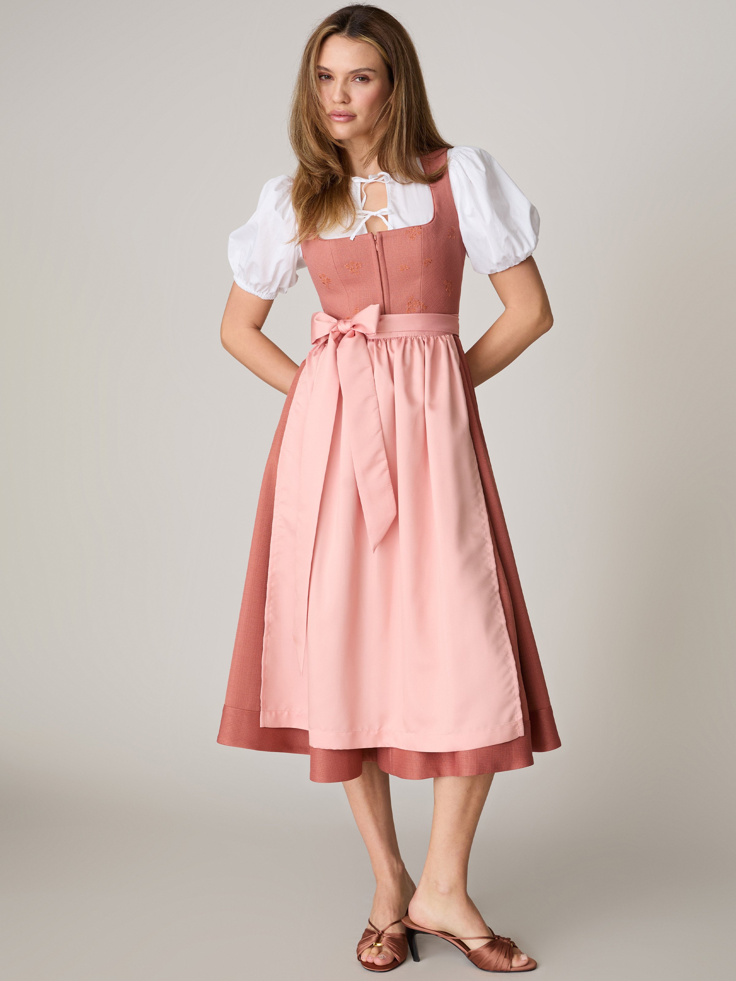 - Inklusive zwei Dirndlschürzen: eine Dirndlschürze in orange und eine rosafarbene Dirndlschürze