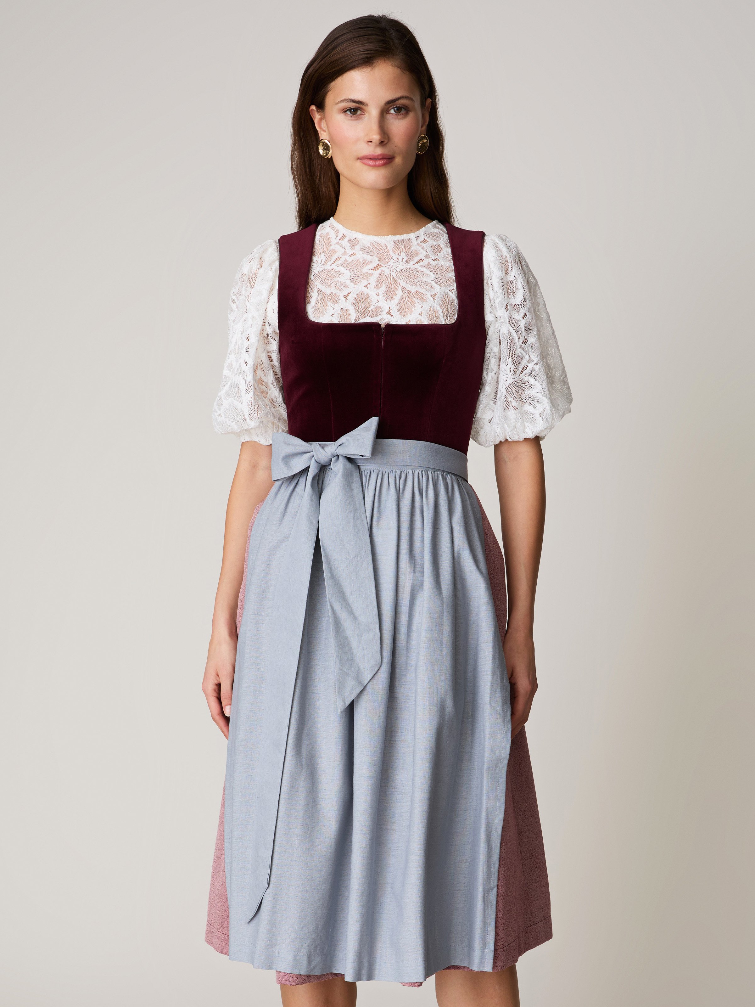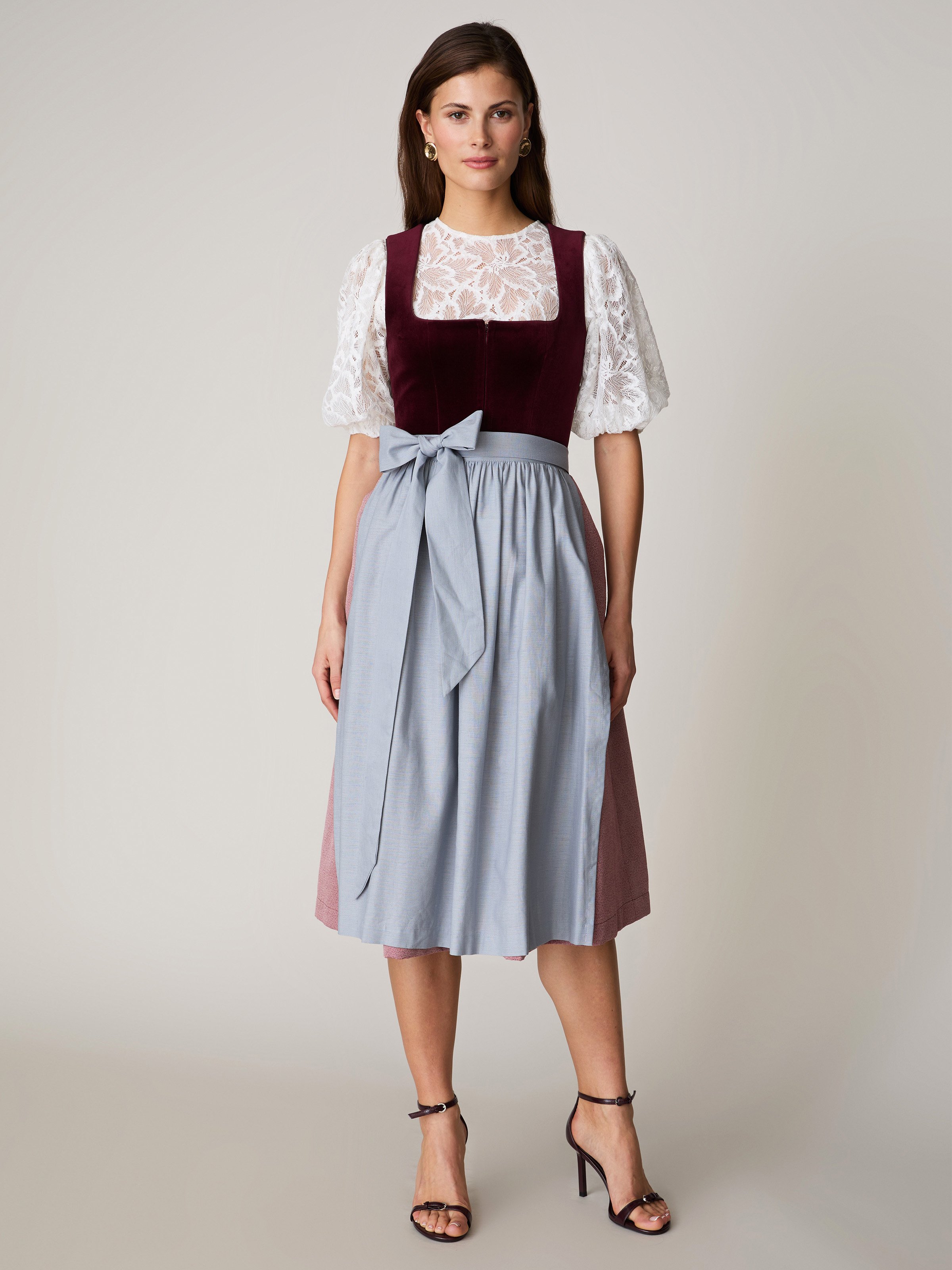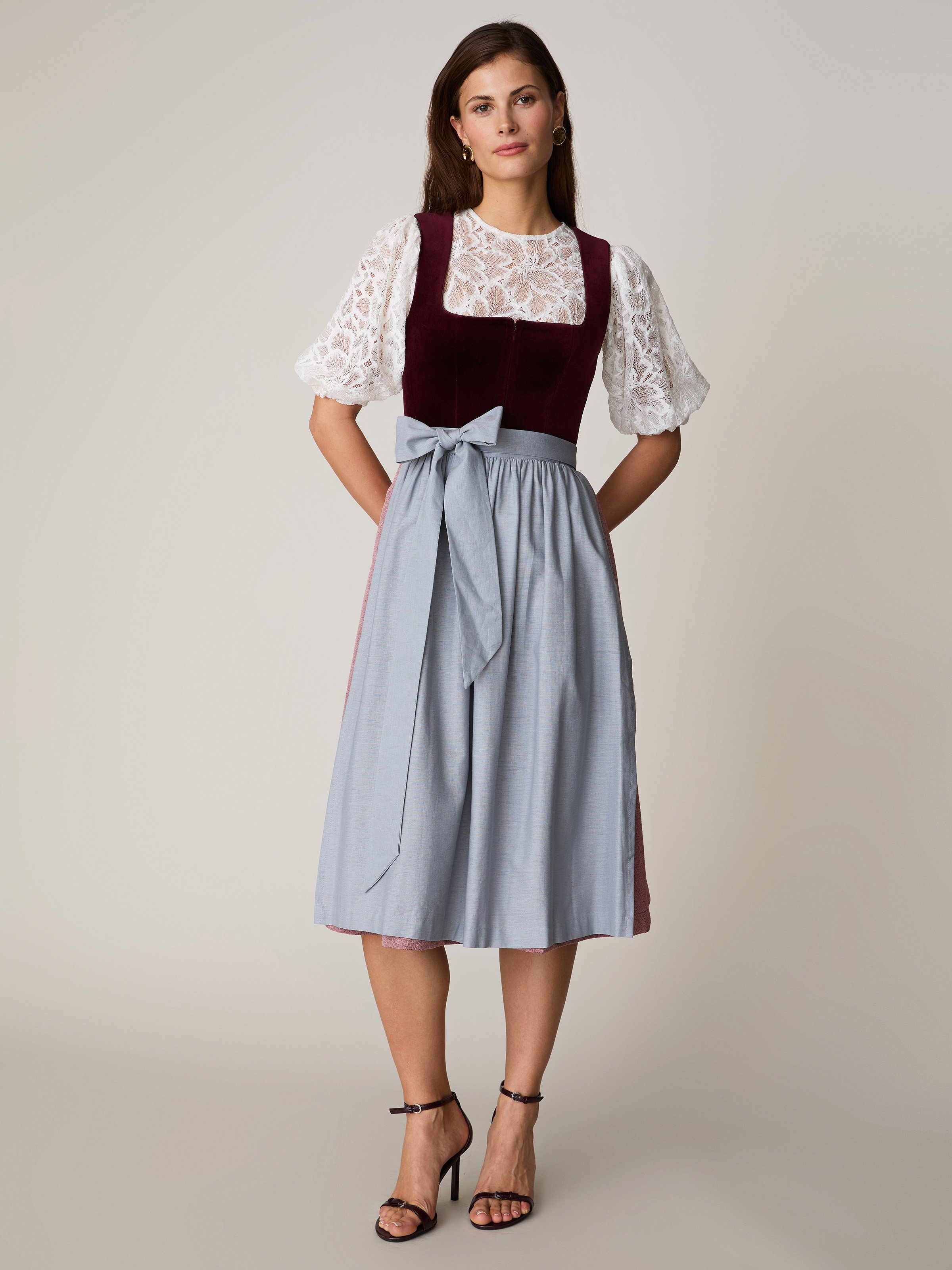 - Inklusive zwei Dirndlschürzen: eine blaugraue Leinenschürze und eine weinrote Dirndlschürze