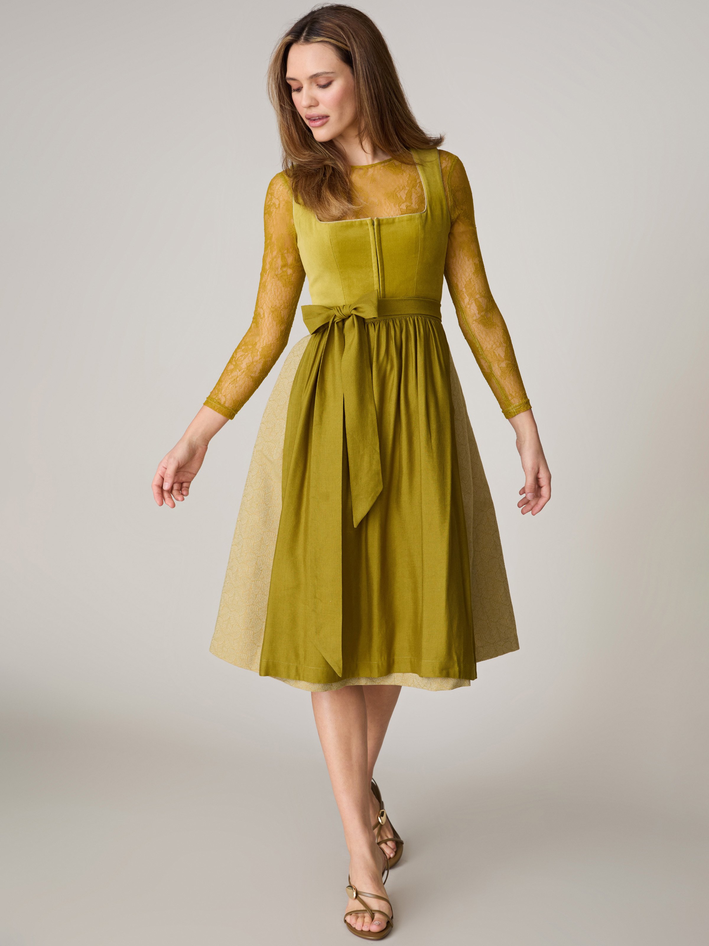 Die Spitzenbluse Mina Avocado sorgt für einen klaren Wow-Effekt – besonders in Kombination mit dem passenden Dirndl Naomi Avocado Oil. Die zarte, florale Spitze liegt figurnah an und betont eine schmale Silhouette, während der hochgeschlossene Rundhalsausschnitt den Look modern und clean hält. Das Hellgrün in Avocado ist außerdem eine der Trendfarben 2026 und bringt genau den Fashion-Twist in die Tracht, der gerade so gefragt ist.