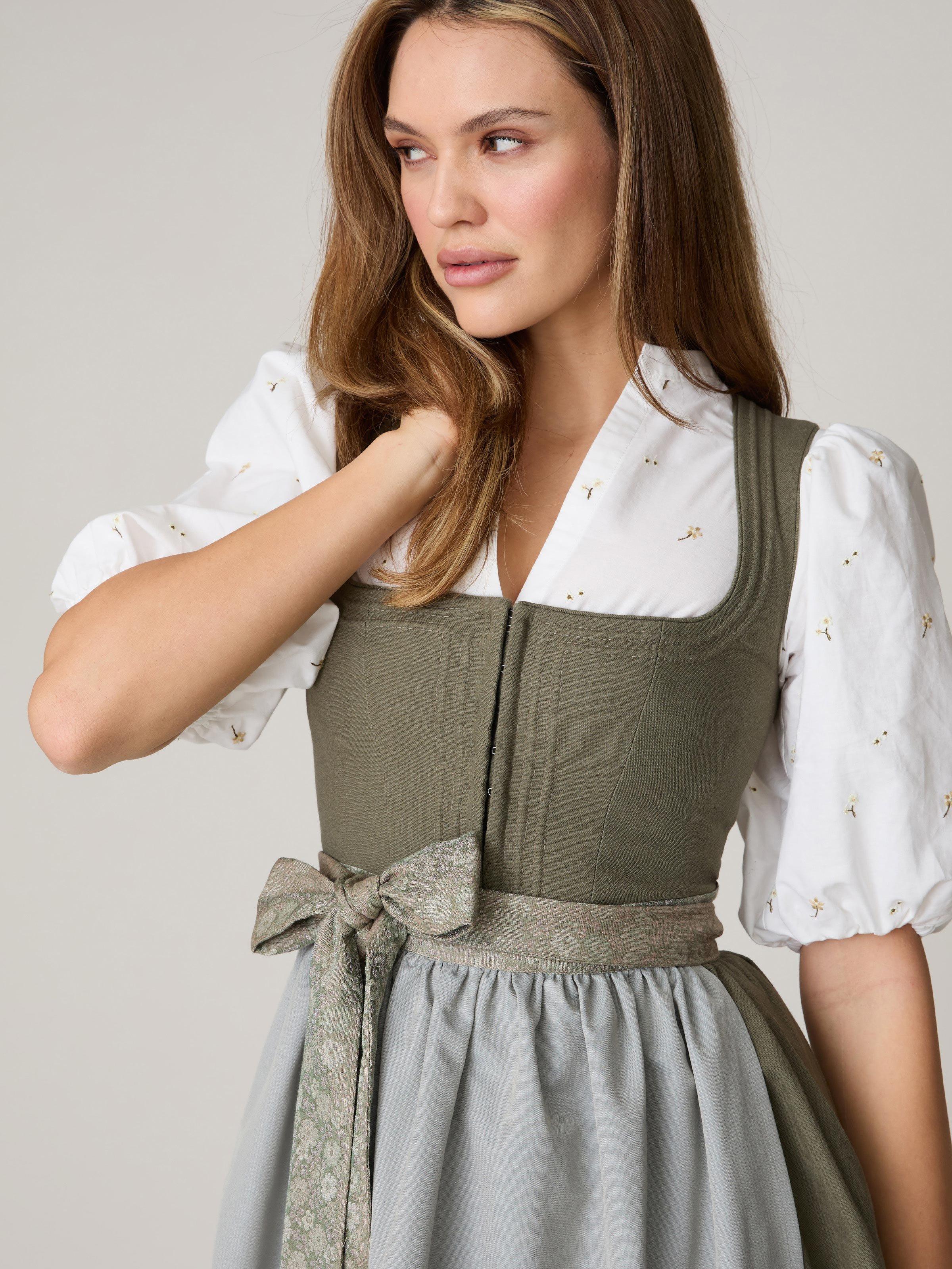 - Inklusive zwei Dirndlschürzen: eine olivgrüne Dirndlschürze mit Biesen und eine grüne Dirndlschürze mit floralem Schürzenband