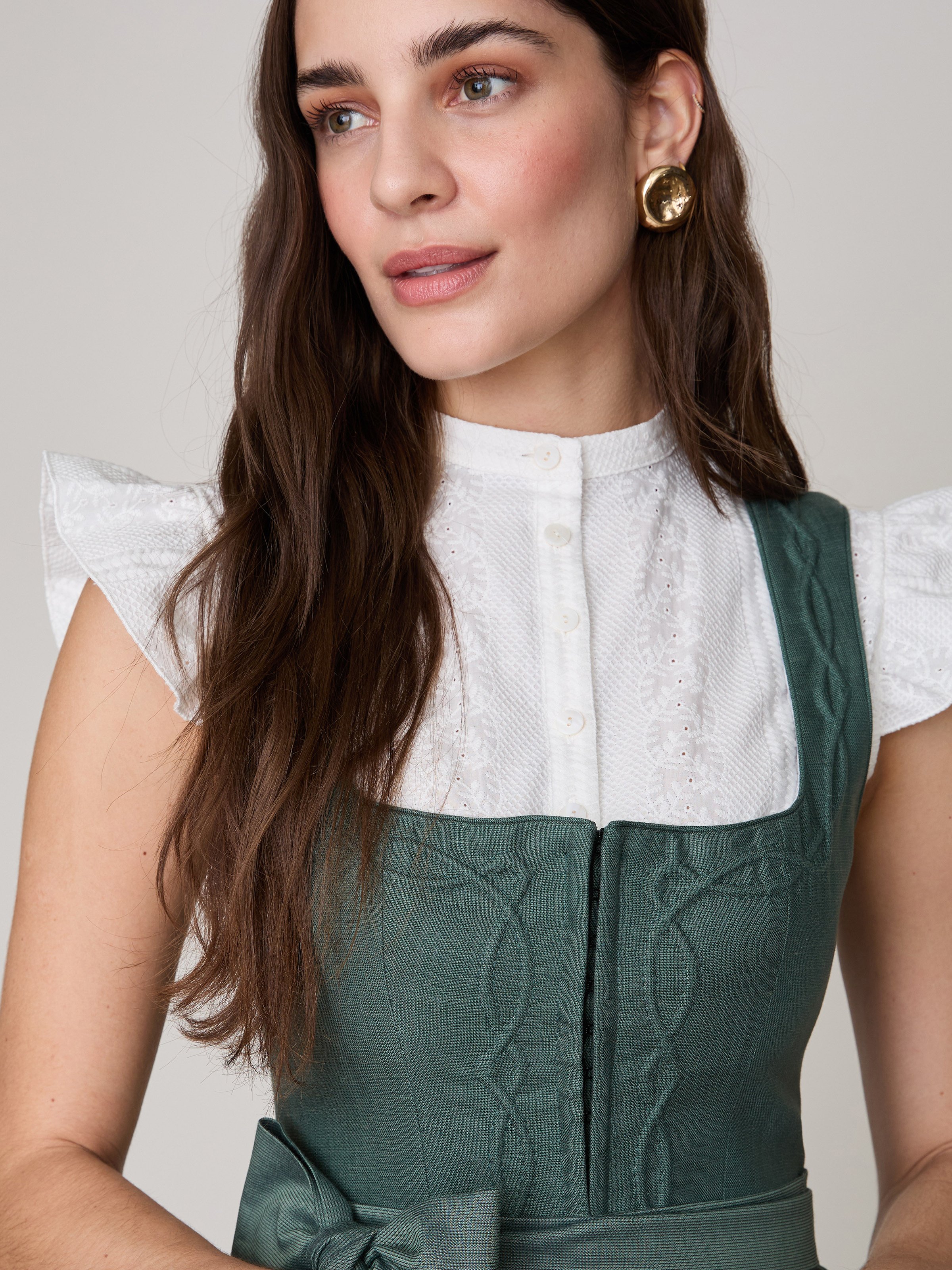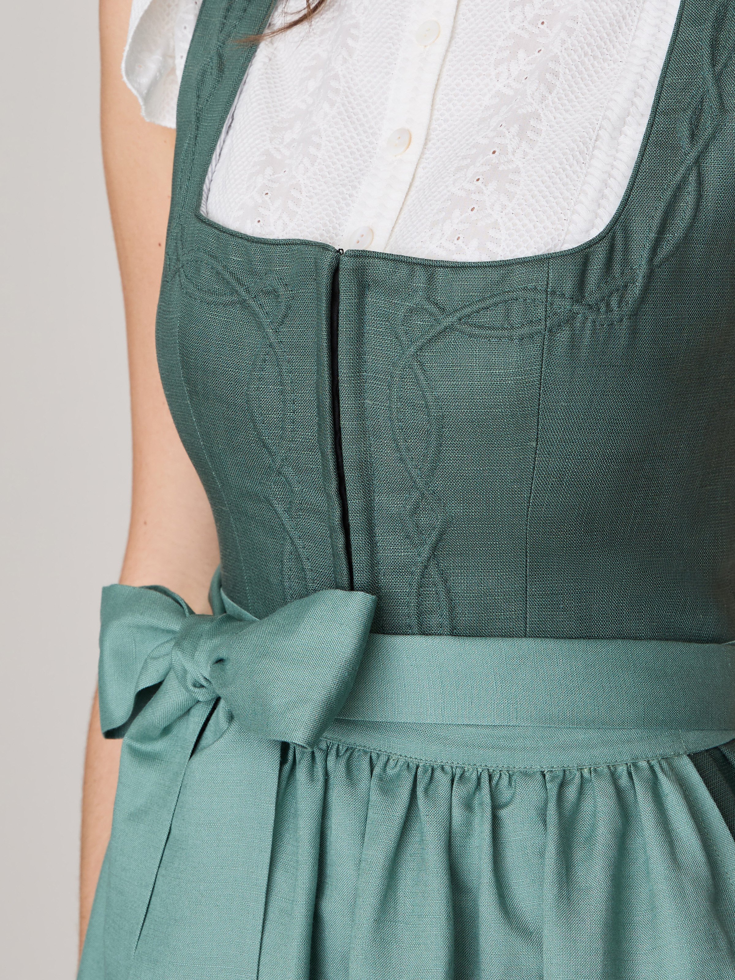 - Inklusive zwei Dirndlschürzen: einer smaragdgrünen Dirndlschürze und eine Leinenschürze in Petrol